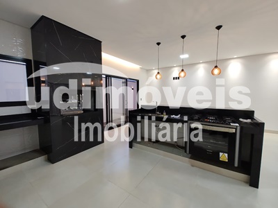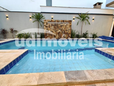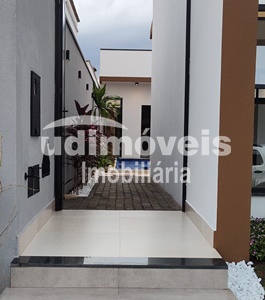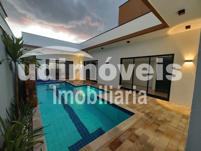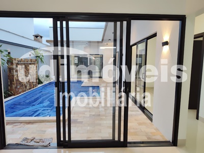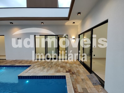 Casa térrea com sala, cozinha, ilha, pia e churrasqueira integradas, três suítes (sendo a master com estrutura para closet), pontos para ar-condicionado nos quartos e na cozinha, persianas automatizadas com black-out nos quartos, área de serviço, piscina aquecida com pontos de hidromassagem, iluminação em LED, aquecimento solar em toda a casa. Garagem para dois carros cobertos e dois descobertos. Área construída de 214m² em um terreno de 360m². Teto rebaixado em gesso e iluminação embutida em LED em toda a casa, com sala de pé direito duplo.